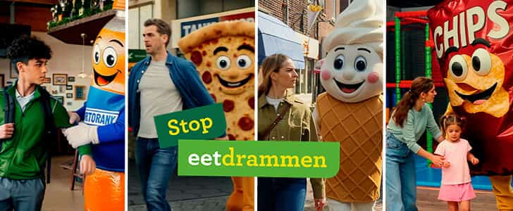 Tekst: Stop eetdrammen. Beeld: Een jongere wordt aan de arm getrokken door levensgrote sportdrank, man wordt achtervolgd door pizzapunt, vrouw wordt achtervolgd door softijs en moeder en kind door chipszak