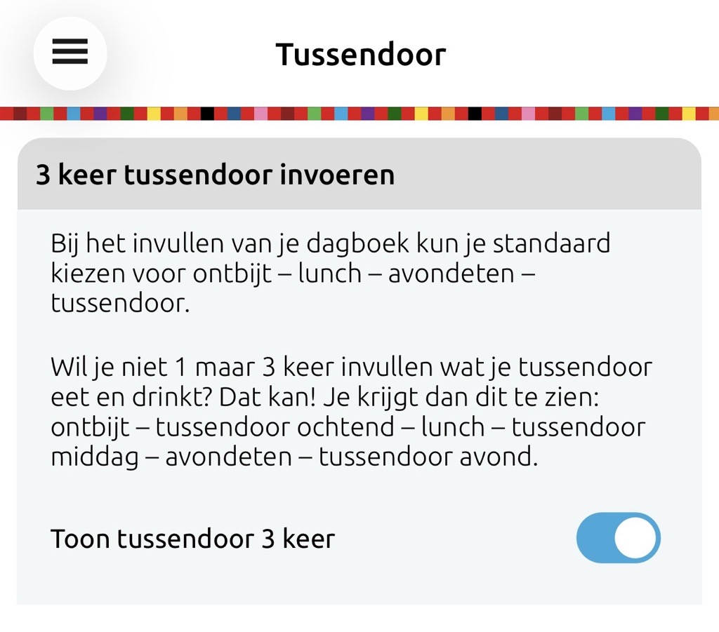 Standaard zie je bij het invullen van je dagboek 1 tussendoormoment. Voor het koolhydraten tellen is het makkelijker om op 3 momenten te kunnen invullen wat je eet en drinkt. Stel dit in bij de instellingen van Mijn Eetmeter onder Tussendoor.