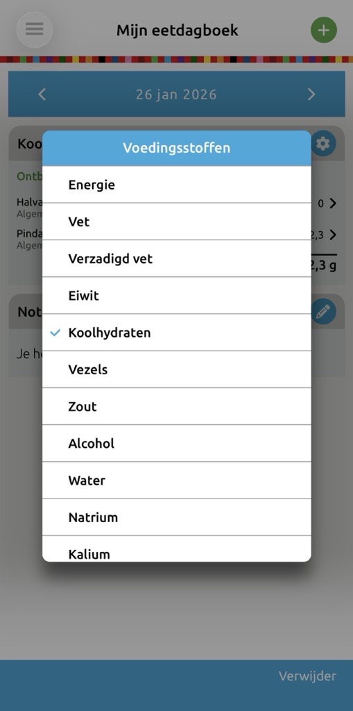 Het kan zijn dat je diëtist, diabetesverpleegkundige of arts je heeft gevraagd om koolhydraten te tellen. Klik bij het invullen van je eetdagboek in het menu waar standaard energie (kcal) staat op het tandwieltje. Kies hier vervolgens voor koolhydraten. Dan zie je per eetmoment (ontbijt, lunch, avondeten en tussendoor) hoeveel koolhydraten je binnenkreeg.