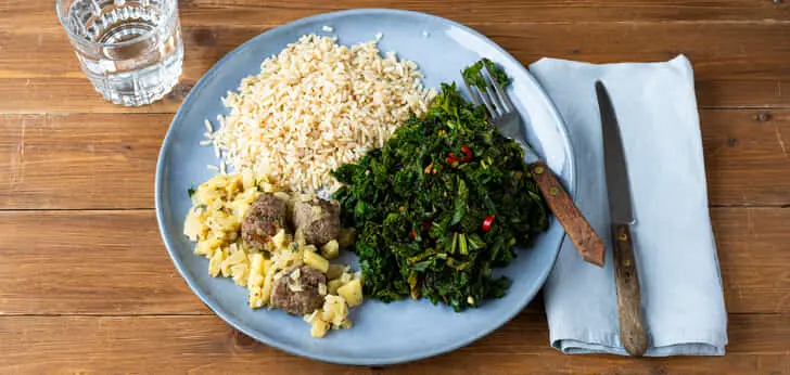 Recept van het Voedingscentrum: Appelstoof met tartaarballetjes, pittige boerenkool en rijst