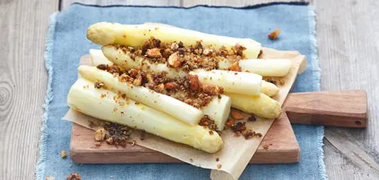 Laat de asperges uitlekken, leg ze op een schaal en strooi de kruimels erover.