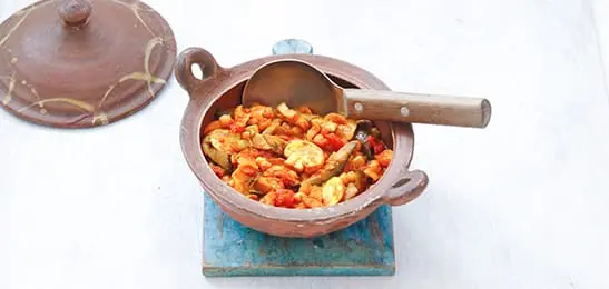 Verwarm de rest van de olie en fruit hierin de ui en de knoflook met de specerijen. Bak de champignons mee.
