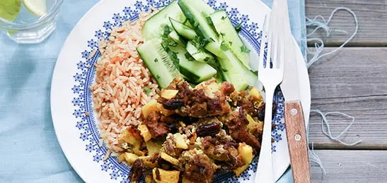 Bobotie is een Zuid-Afrikaanse ovenschotel met onder andere gehakt en rozijnen. Deze gezonde variant wordt geserveerd met komkommersalade en rijst.