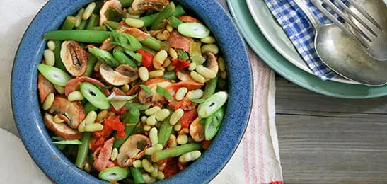 8. Doe de flageolets, de tomatenblokjes en de champignons bij de sperziebonen en stoof de groente in enkele minuten verder gaar.