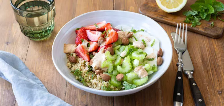 9. Verdeel de quinoa, groente en aardbeien over een bowl.
