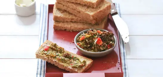 Zelfgemaakte sandwichspread van zonnebloempitten, selderij, lijnzaad, sjalot en paprika.
