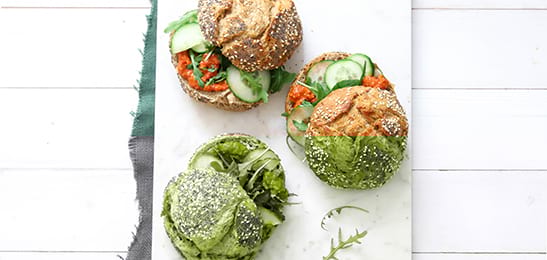 Snijd de broodjes open en besmeer ze met halvarine en muhammara.