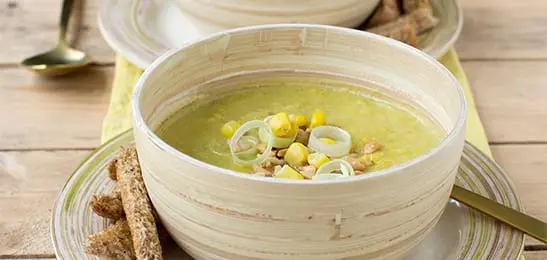 Voeg de rest van de prei en de mais toe en breng de soep weer aan de kook.