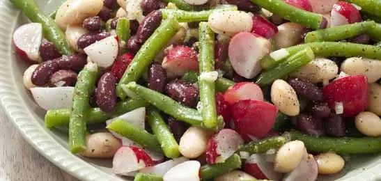 Meng de dressing door de sperziebonen, kidneybonen en witte bonen en laat dit op een koele plaats een half uur intrekken.
