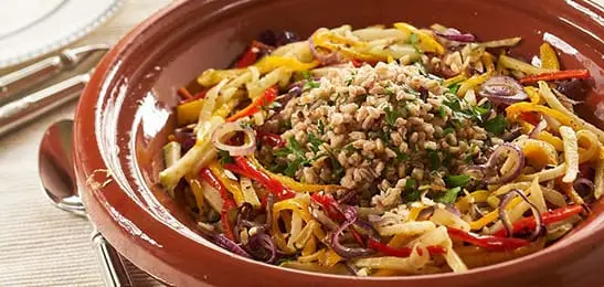 Meng de selderij en de hazelnoten door de farro en serveer de geroosterde groente erbij.