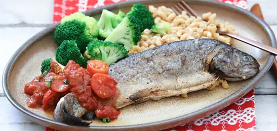 - Bestrooi de forellen van binnen en van buiten met peper, bestuif de vis met volkorenmeel en was je handen.