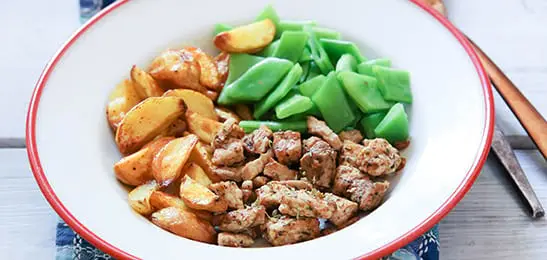 Recept van het Voedingscentrum: Gebakken aardappelen met kruidige vleesreepjes en snijbonen