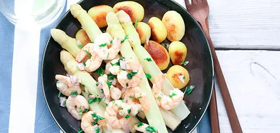 - Serveer de asperges met het garnalenmengsel de krieltjes.