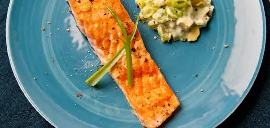 Bestrooi de zalm met peper en gril de vis in 6-8 minuten aan beide zijden lichtbruin en gaar.