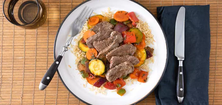 Schep de groente op de rijst en schik het vlees erop.