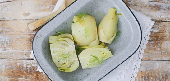 Voeg 150 ml water met wat citroensap en de venkel toe en stoof de groente in ca. 10 minuten gaar.