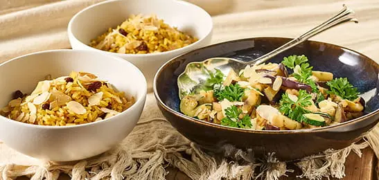 Meng de rijst door het amandel-rozijnenmengsel.