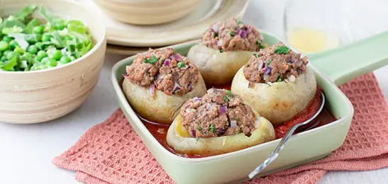- Vul de aardappelen met het vleesmengsel, zet in de pan met tomatenblokjes en was je handen.