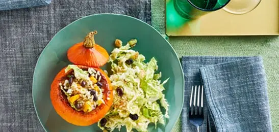 Vul de pompoen met het mengsel en plaats het kapje erop. Laat in de hete oven nog eens 15-20 minuten heet worden en lichtbruin kleuren.