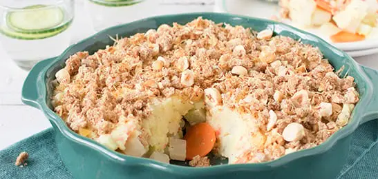 12. Schep de groente in een ovenschaal en dek af met de aardappelpuree. Verdeel het notenmengsel erover.