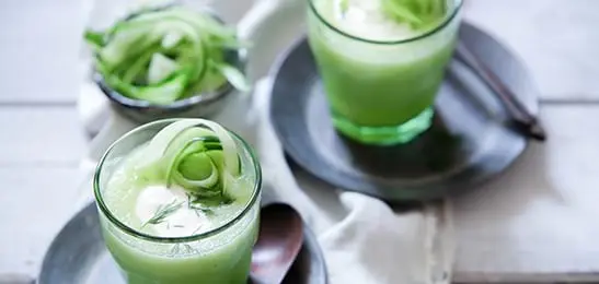Schep de soep in glazen of kommen en garneer met de achtergehouden linten komkommer.