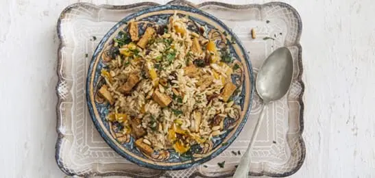 Schep de tofu en de pijnboompitjes door de rijst. Warm het geheel goed door.