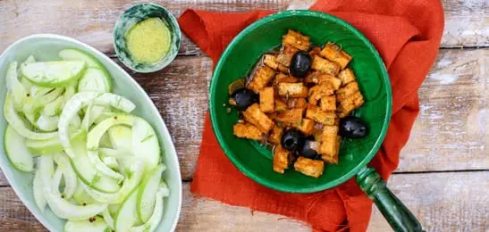 Maak van de aardappelen met de melk, peper en nootmuskaat een puree. Serveer de tempé en venkel erbij.