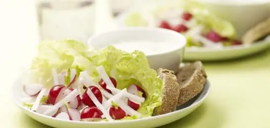 Rol slabladen op, snijd de rettich in repen en halveer de radijs. Verdeel de groente over borden en dip het in de saus.