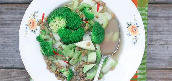 Breng het water met het stuk bouillontablet aan de kook en kook hierin de linzen in 15-20 minuten gaar.