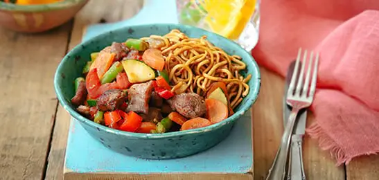 Serveer de mie met de groente en de kip.