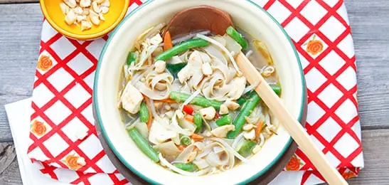 Maak de soep op smaak met wat citroensap. Strooi de cashewnoten erover.