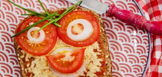 4. Beleg iedere boterham met ui en tomaat en bestrooi met geraspte kaas.
