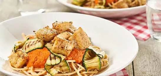 Giet de spaghetti af en roer de pasta door de saus. Leg de plakjes courgette en blokjes vis erop.