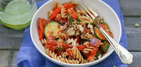 - Breng de groente op smaak met wat peper en Italiaanse kruiden en schep door de pasta.
