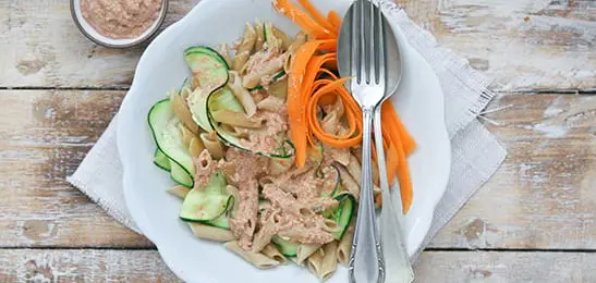 Meng de saus door de pasta en de courgette en garneer met de wortellinten.