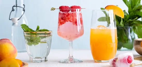 Verdeel over glazen, voeg ijsblokjes toe en garneer met de reepjes perzik.