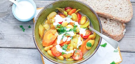 Schep aan tafel de yoghurt op de soep en serveer de volkoren boterhammen erbij.