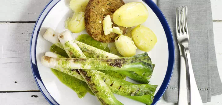 Recept van het Voedingscentrum: Prei in kruidenvinaigrette met aardappelen en burger