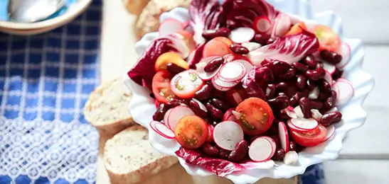 Deze bonensalade maak je met kidneybonen, tomaat, radijs en rode sla. Lekker met volkoren stokbrood.