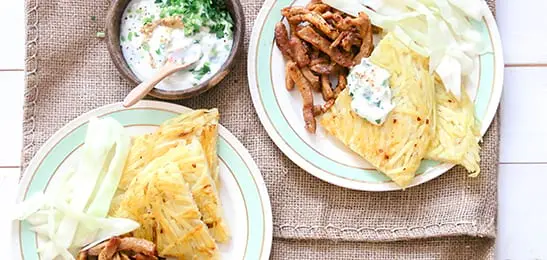 Serveer de kruidendip, de kool en het vlees bij de rösti.