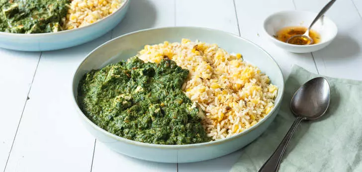 10. Serveer de rijst-linzenmix met de saag paneer en druppel de specerijenolie erover.