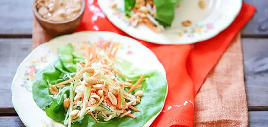 Leg de slabladen op borden en vul met de salade.