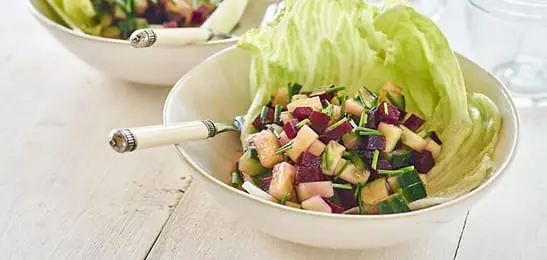 Klop de olie door de azijn en voeg de bieslook en wat peper toe. Meng de dressing door de groente en vul hiermee de slabladen.
