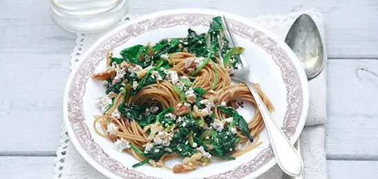 Verdeel de basilicumsaus en walnoten over de spaghetti.