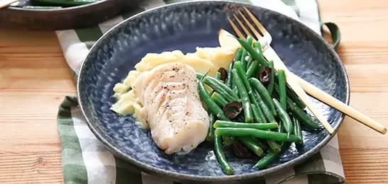 - Serveer de aardappelpuree bij de sperziebonensalade en de vis.