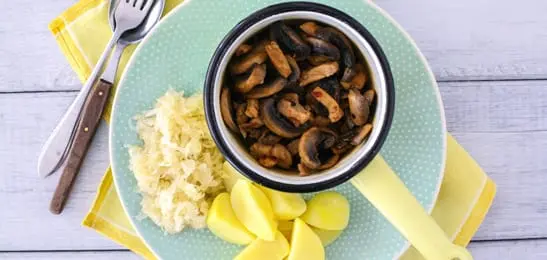 Maak het vlees op smaak met mosterd. Serveer de aardappelen en de kool erbij.
