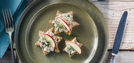 - Beleg elke broodster met wat tonijnsalade en garneer met een schijfje appel en wat achtergehouden dille.