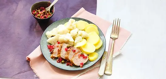 Varkenshaas met rode ui-salsa, bloemkool en aardappelen
