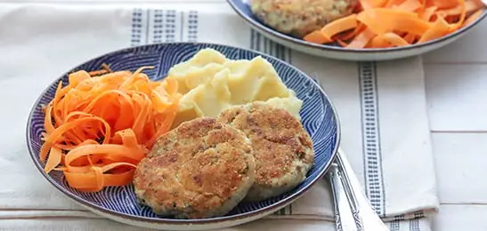 Recept van het Voedingscentrum: Visburgers met aardappelpuree en wortelsalade