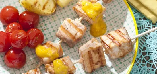 Serveer de mangomosterdsaus, tomaten en het stokbrood bij de visspiesen.